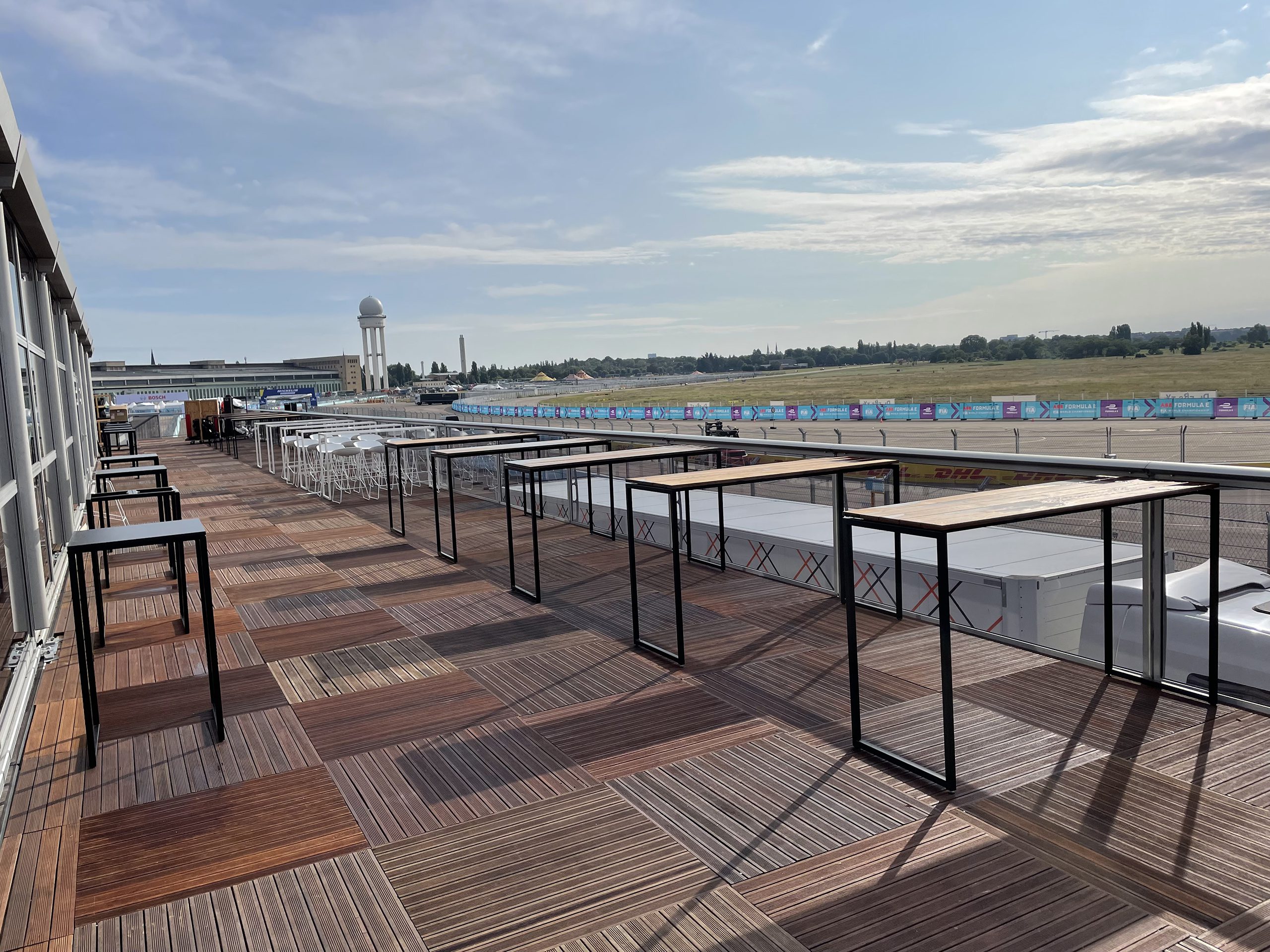 Wij hebben voor dit evenement diverse vloeren gelegd met tapijttegels en hardhouten bankirai tegels.